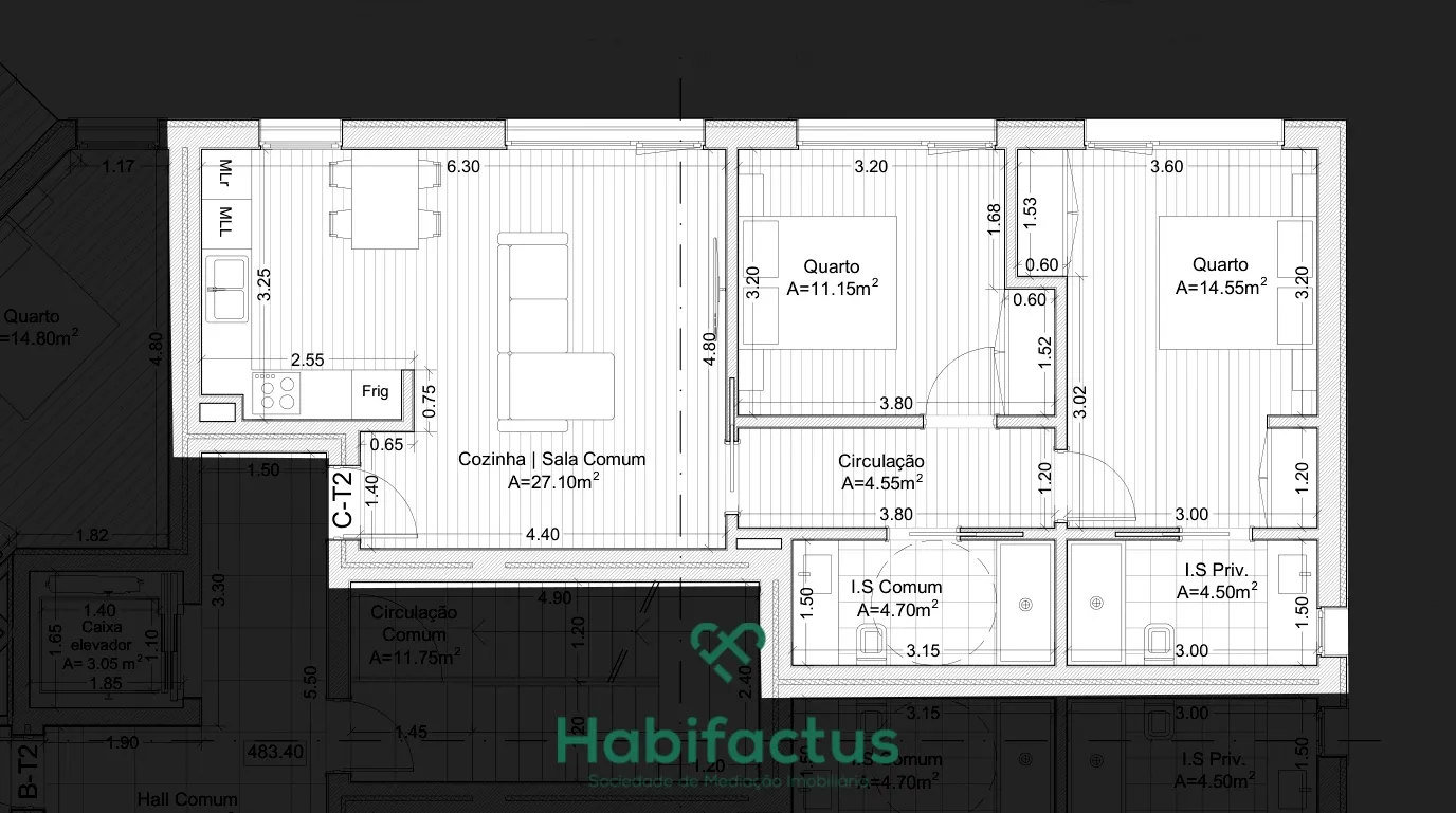 Este T2, é composto por; hall, sala e cozinha, em open space, casa de banho completa, dois quartos, sendo em deles suite e roupeiros embutidos.