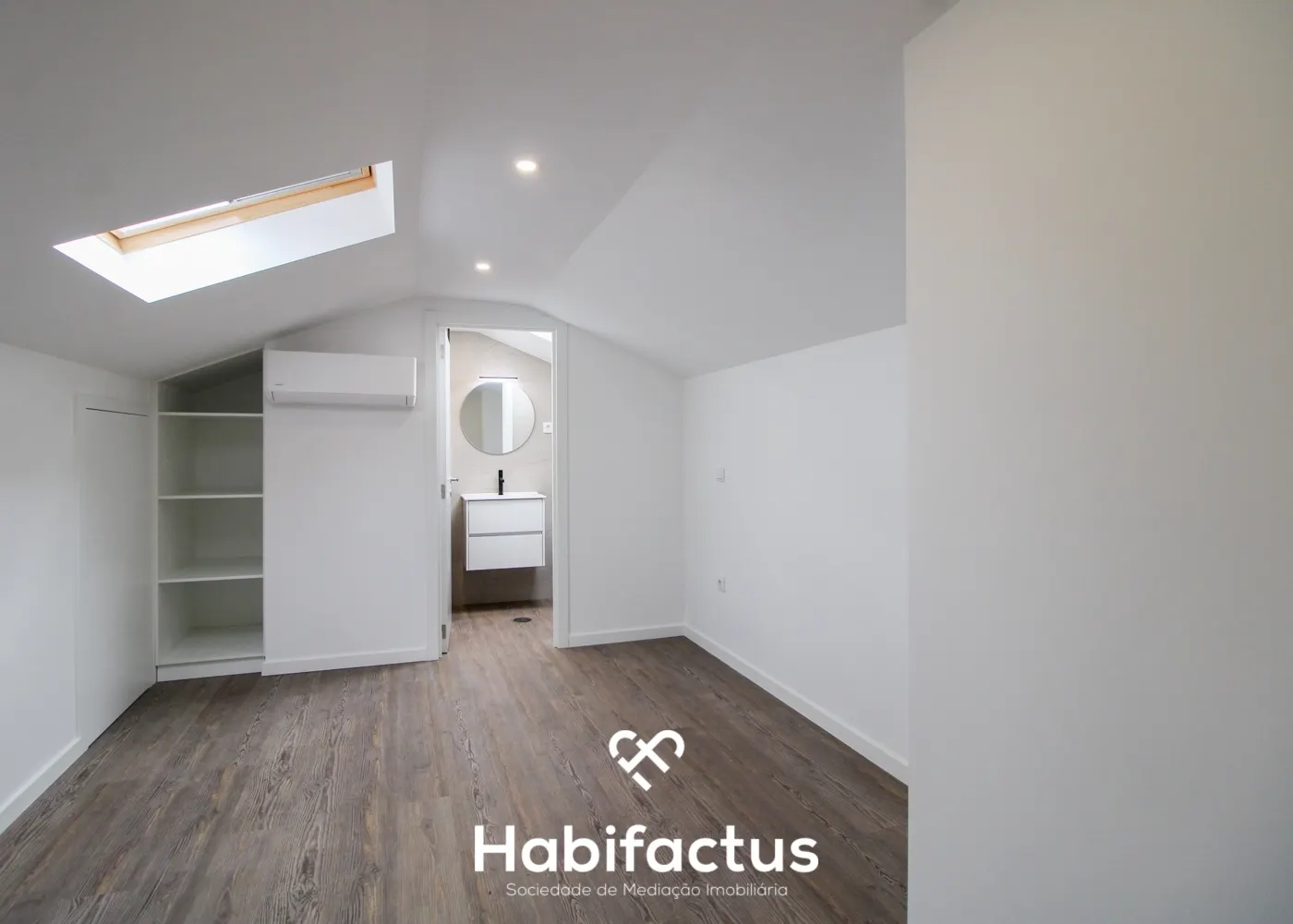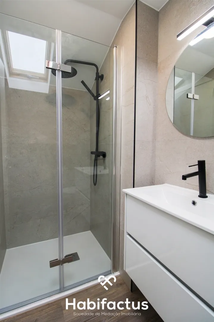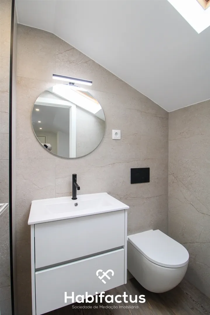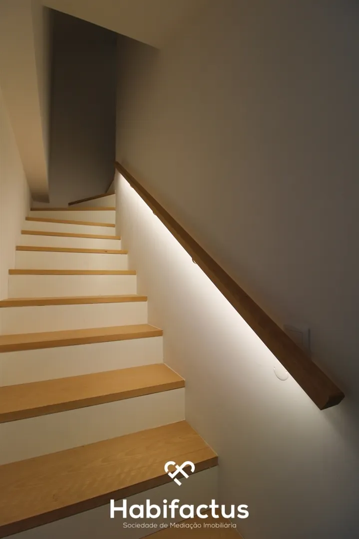 No piso principal, encontram-se dois quartos com roupeiros embutidos e um terceiro espaço que pode ser utilizado como escritório ou quarto adicional. Uma casa de banho completa serve esta área. No piso superior, há um quarto com suite, além de um espaço de arrumação no sótão, oferecendo praticidade e conforto.
