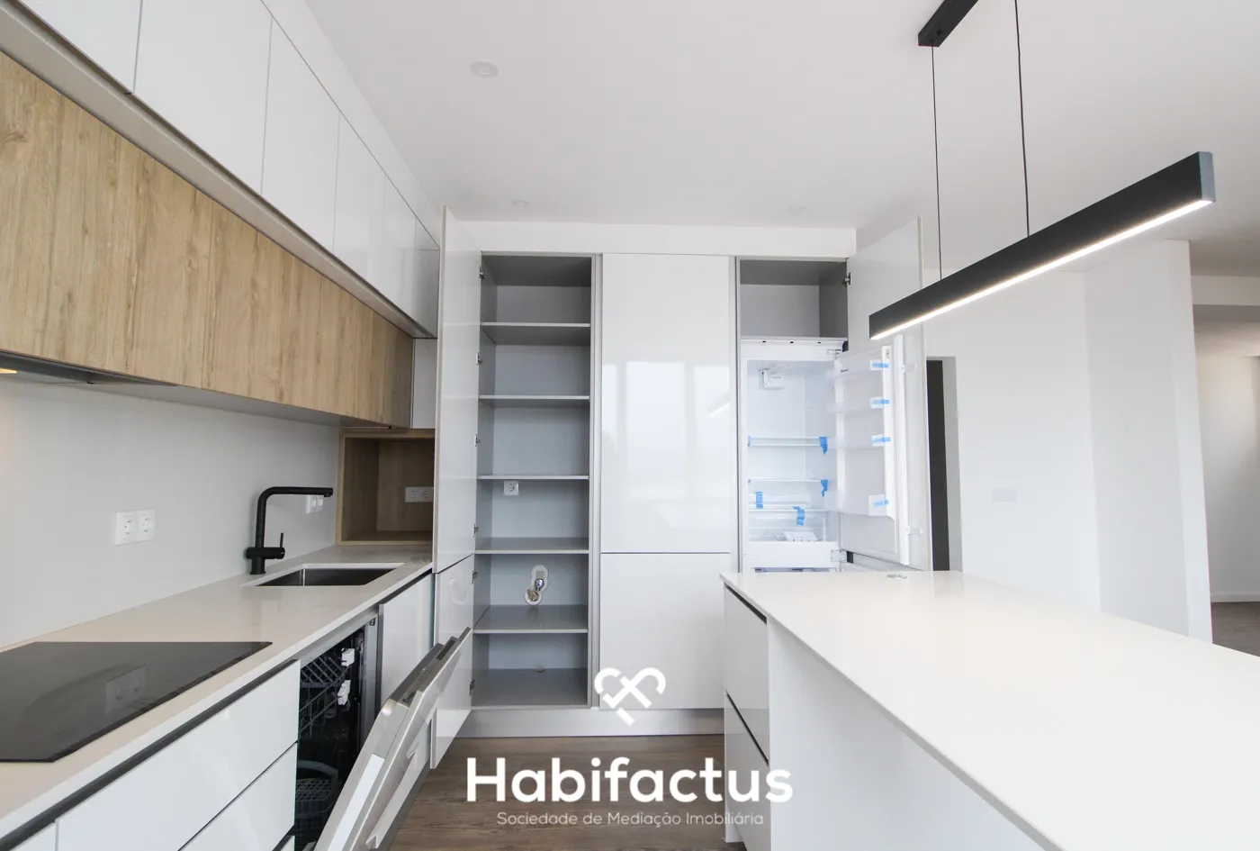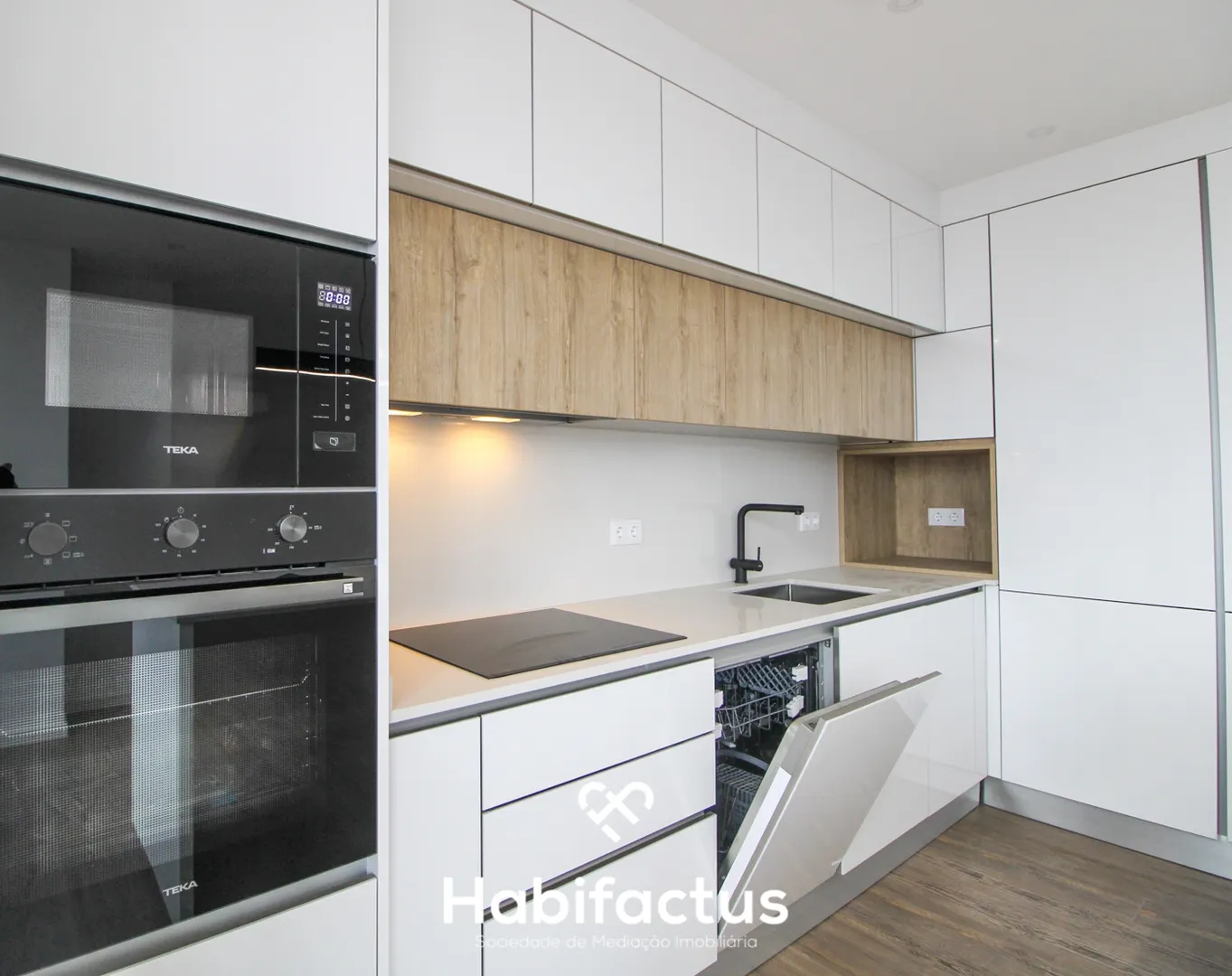 O apartamento distribui-se por um hall de entrada acolhedor, uma cozinha moderna e uma sala integrada, ideal para momentos de convívio. A cozinha, equipada e mobilada com um estilo contemporâneo, dispõe de uma bonita ilha funcional, perfeita para refeições e socialização.