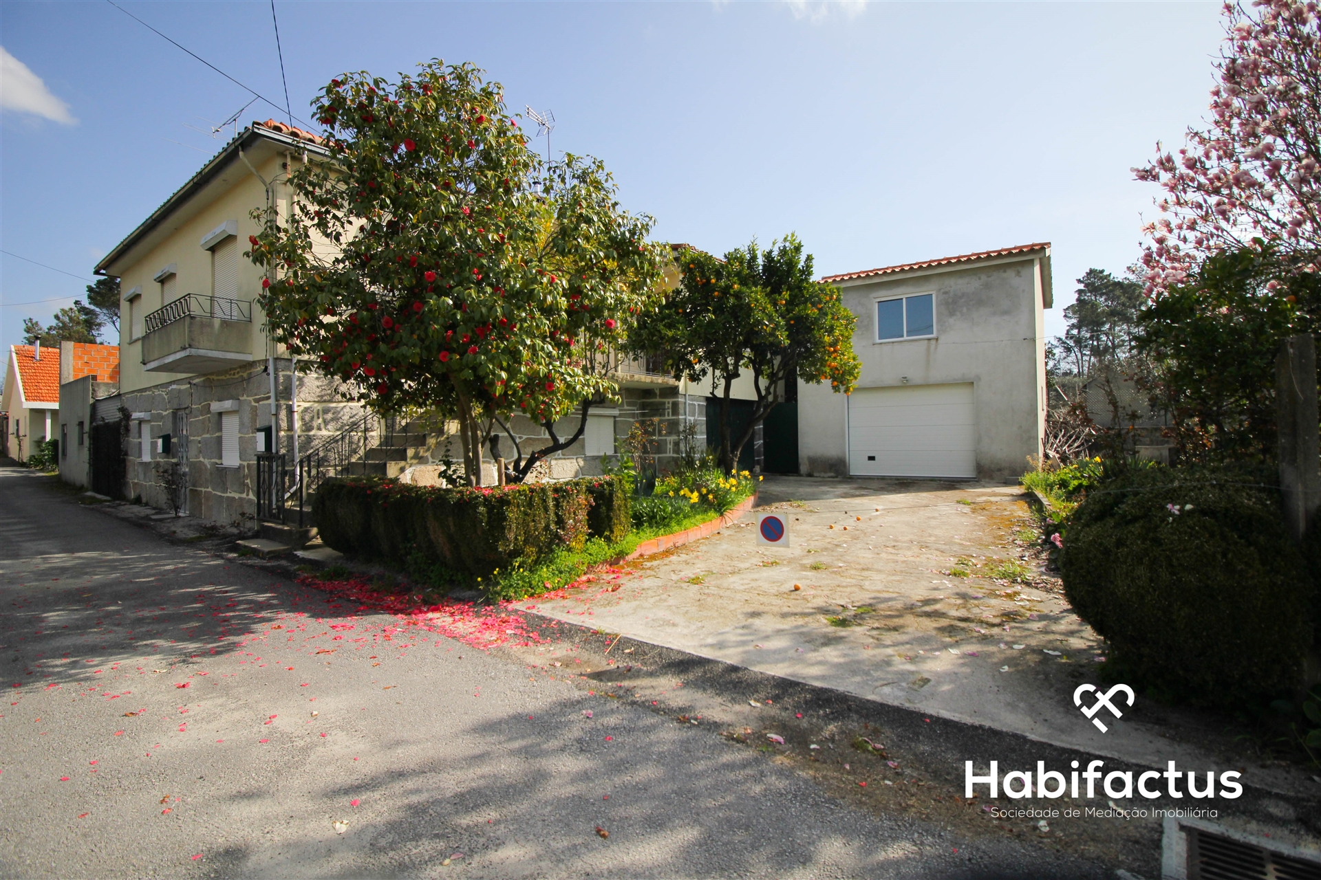 Um espaço exterior agradável com algumas árvores de frutos, poço e garagem.
